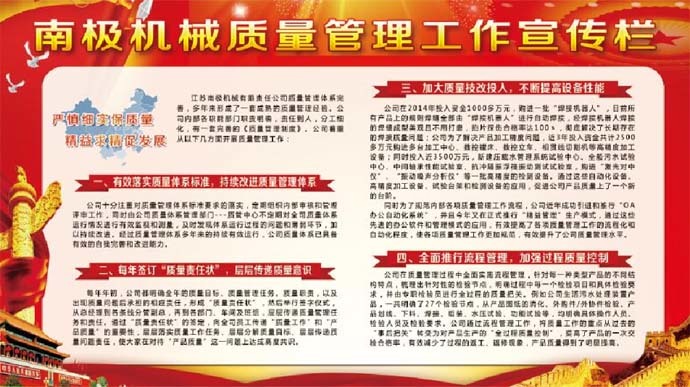 9月份是全国“质量月”,依照泰兴市质量强市工作领导小组办公室的统一部署,并结合企业质量建设工作实际,南极机械精心组织了一系列质量宣传、质量提升和群众性质量活动,全司上下质量建设工作的氛围更加浓厚。
